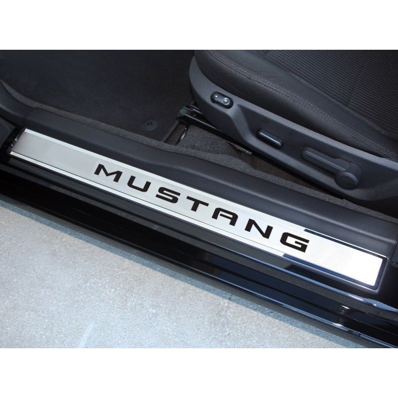 Dress up your Mustang with our Polished/Satin Stainless Steel Doorsills with ”MUSTANG” script Carbon Fiber inlay. These trim pieces are designed to fit on the stock outer door sill.