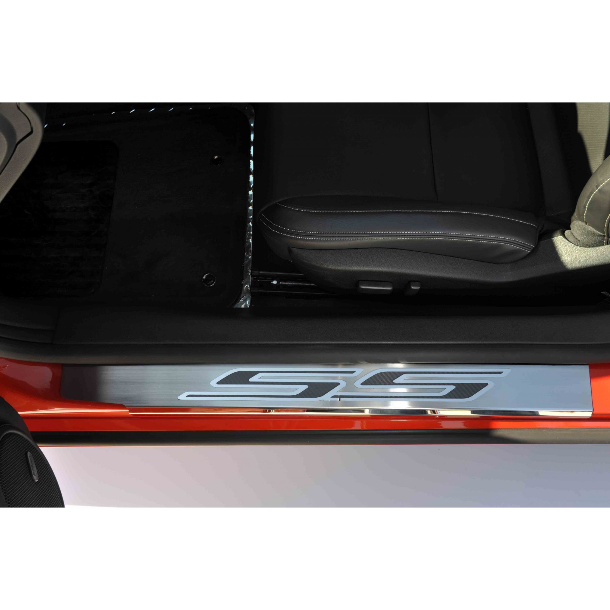 Dress up your Camaro w/ our Satin/Polished Stainless Steel, Doorsills w/ Carbon Fiber ”SS” script, w/ BLUE CARBON FIBER vinyl color. Fits all 2010-2015 Coupe/Convertible Camaros over outer doorsill.
