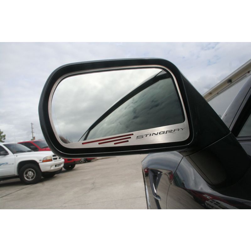 Dress up your Stingray Corvette with our Satin Stainless Steel Side View Mirror trim with ”Stingray” Lettering, with Brushed Black vinyl color. Designed to fit within the outer frame of the side view mirror. More colors available.