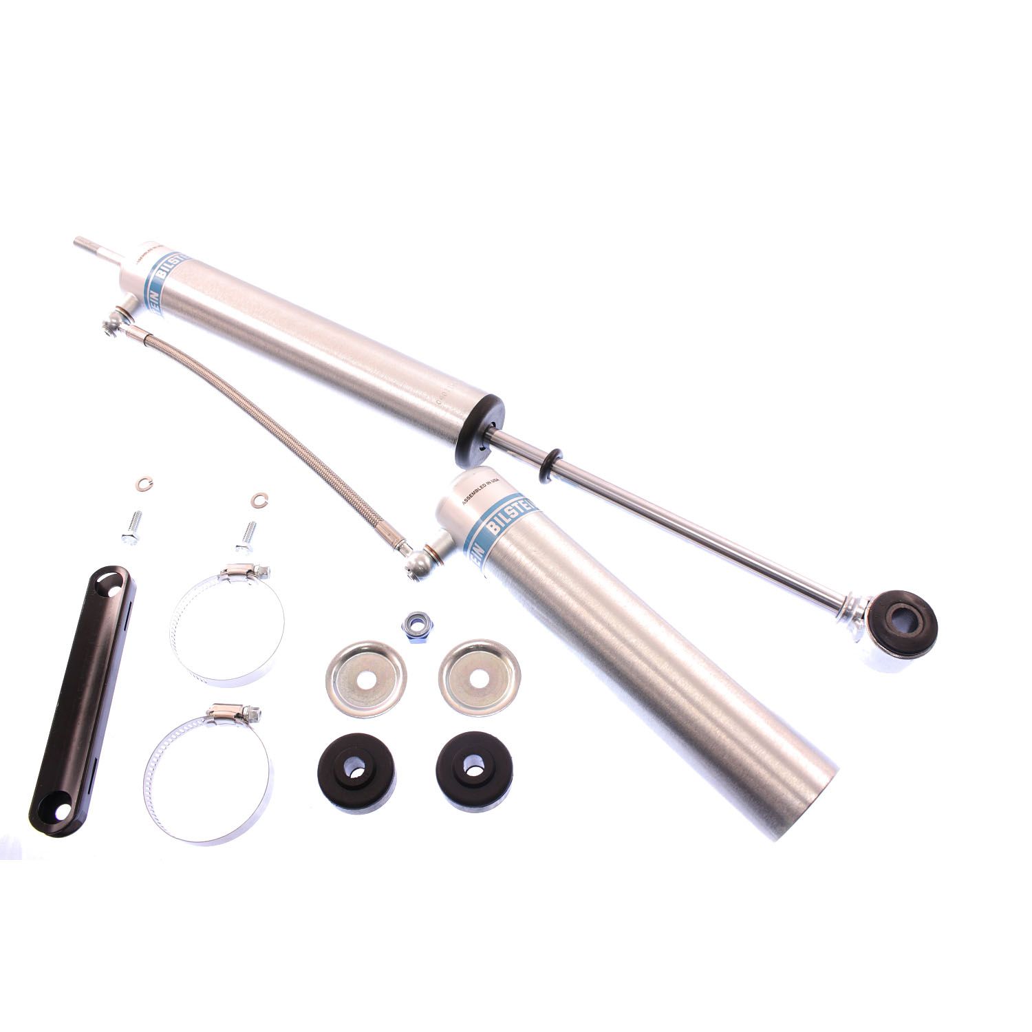 Bilstein B8 5160 remote reservoir shock absorbers are designed as a direct fit solution for lifted trucks and SUV’s. The remote reservoir will offer increased cooling capacity and wheel travel to optimize overall performance compared to a traditional shock absorber. These shock absorbers feature a monotube design for consistent fade free performance and utilize velocity sensitive digressive valve settings which are tuned for each specific application. Each shock absorber is fitted with a unique 360 degree swivel banjo hose fitting, providing a clean, low profile installation. B8 5160 remote reservoir shock absorbers will increase overall durability of your vehicle allowing you to conquer the harshest of off-road environments.